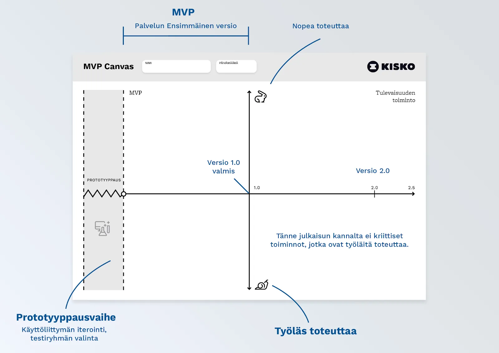Kehitimmekin näiden tarpeiden pohjalta oman työkalun, jossa prototyyppaus, Minimum Viable Product (MVP) ja tulevaisuuden toiminnot on eritelty omiksi vaiheiksi.