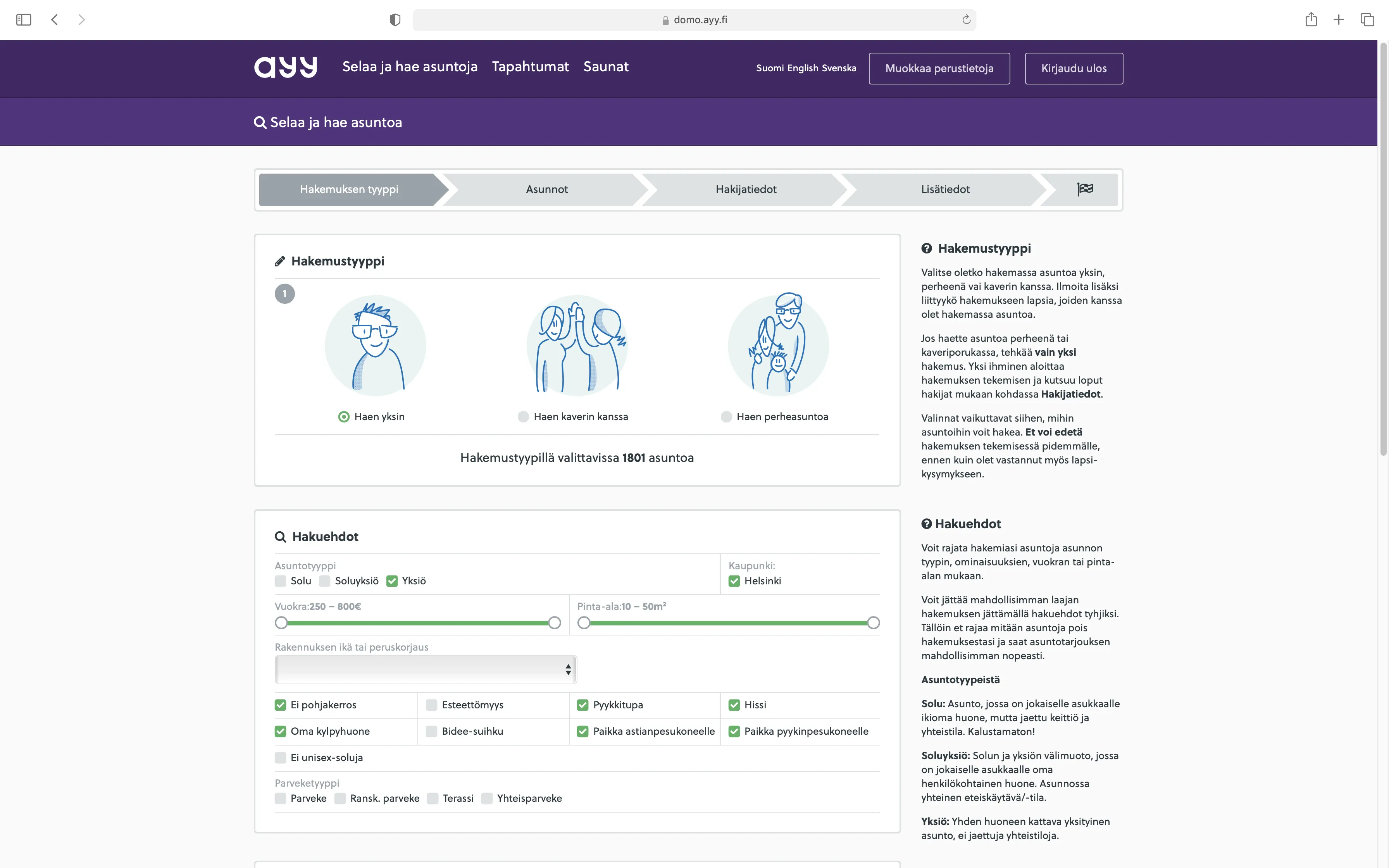 Domo-palvelun kautta opiskelija voi selailla ja hakea AYY:n tarjoamia asuntoja. Palvelussa opiskelija voi selailla eri asuntoja ja tehdä hakemuksen haluamiisi asuntoihin. Domo näyttää nopeasti, mitä on tehtävänä ja paljonko, joka nopeuttaa asioiden hoitamista.
