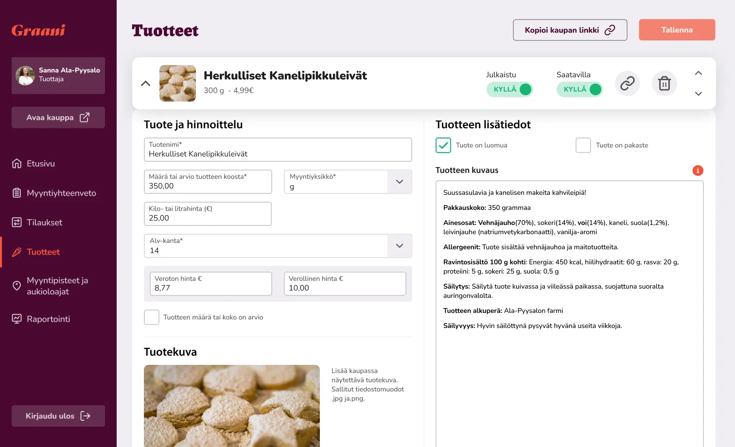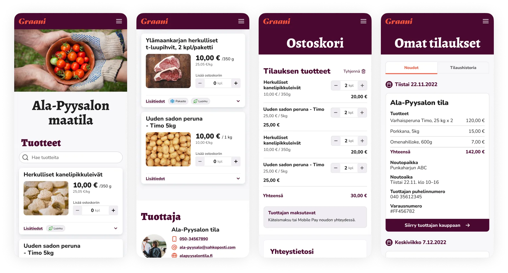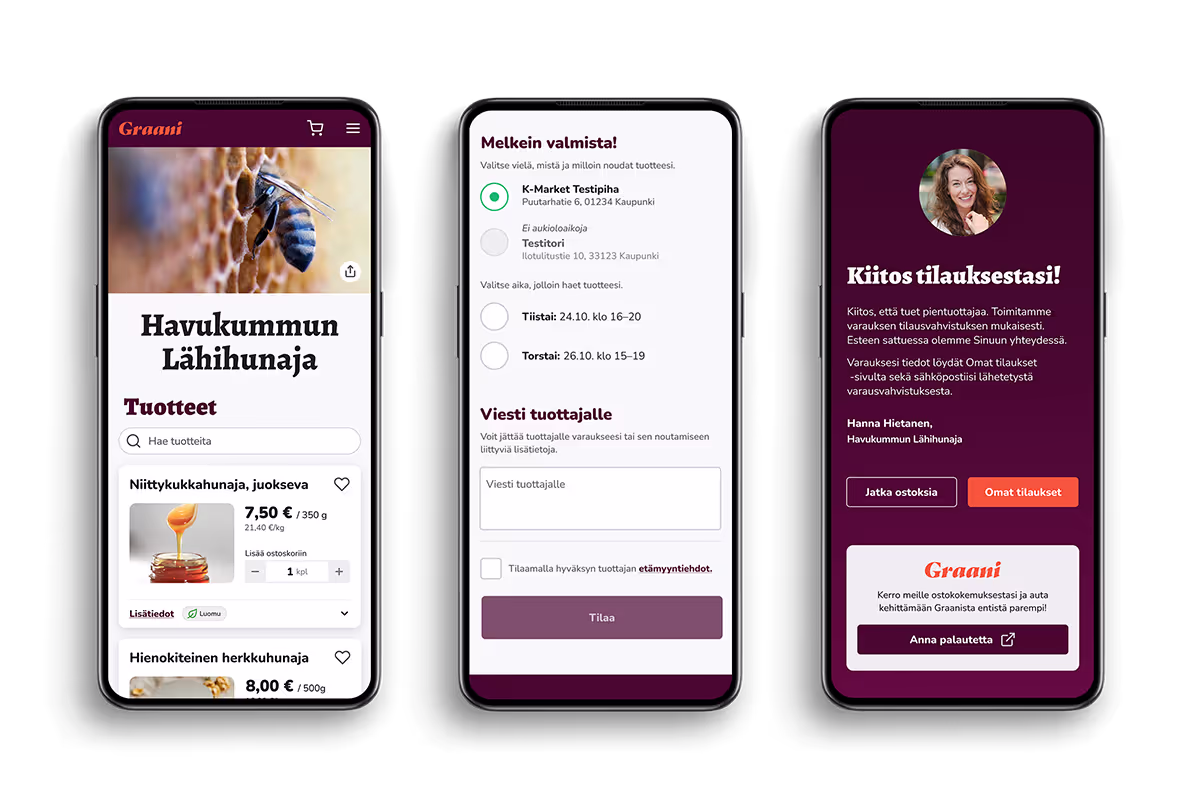Alkutuottajien on usein haastavaa löytää digitaalisia suoramyynnin palveluita, jotka vastaavat juuri heidän tarpeisiinsa. Samalla kuluttajien voi olla vaikeaa löytää lähituottajia ja ostaa tuotteita suoraan heiltä. Halusimme yhdessä Graanin kanssa vastata näihin haasteisiin ja kehittää innovatiiviset ja helppokäyttöiset työkalut suoramyynnin digitalisointiin, automatisointiin ja hallintaan. Ratkaisumme on suunniteltu integroitumaan vaivattomasti tuottajien päivittäisiin prosesseihin ja tukemaan heidän arkeaan tehokkaasti.