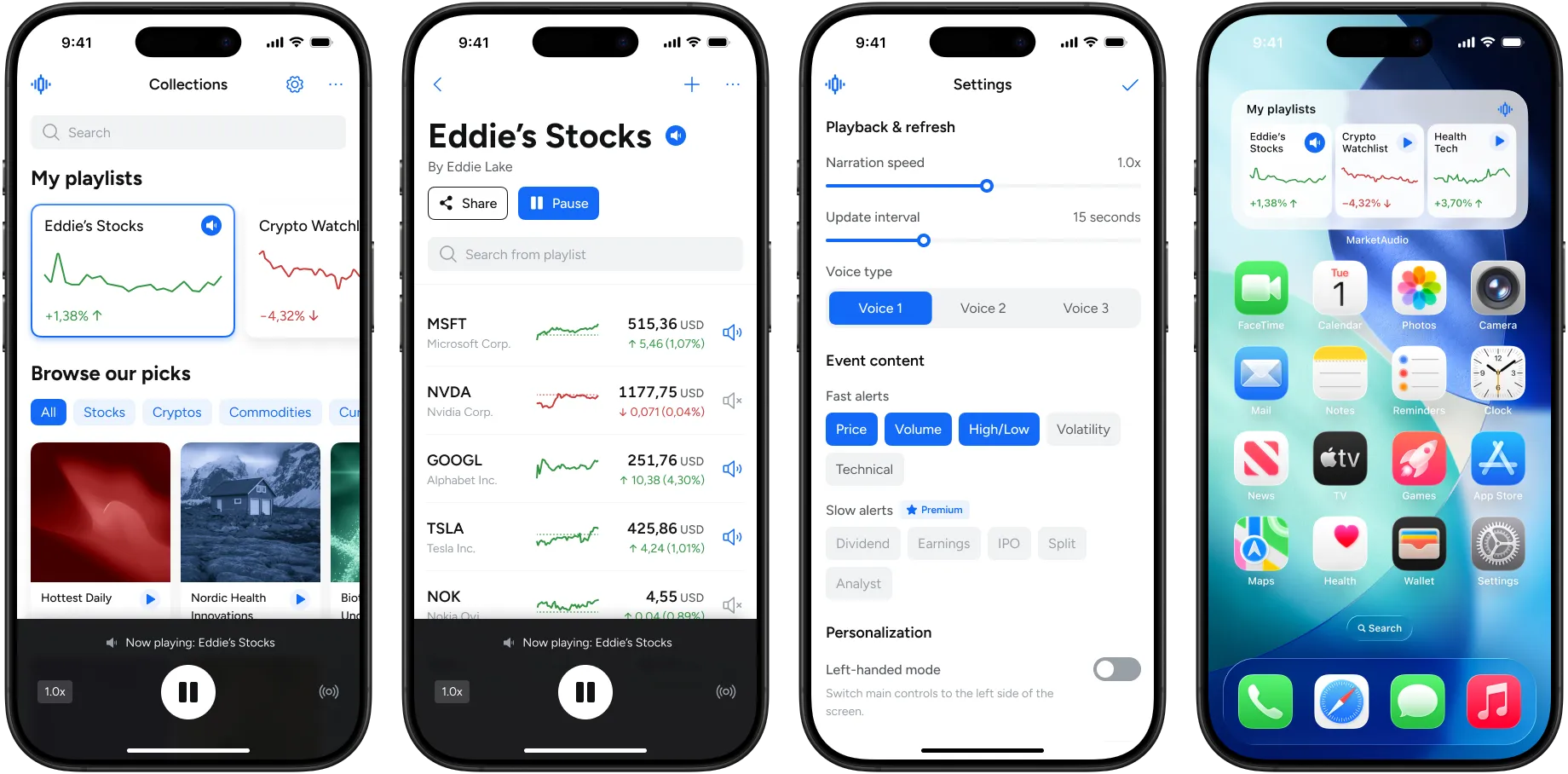 Mockupit ja käyttötilanteiden visualisoinnit auttoivat konkretisoimaan palvelun idean. Rakensimme käyttöliittymä-mockupit, joissa korostuvat liikkuminen ja helppous: käyttäjä voi kuunnella markkinatietoja missä tahansa kuulokkeiden kautta. Koska yksi tärkeä kokonaisuus sovelluksessa on saavutettavuus, rakensimme osaksi mockuppeja myös yksinkertaisen vasenkätisen käyttöliittymän.