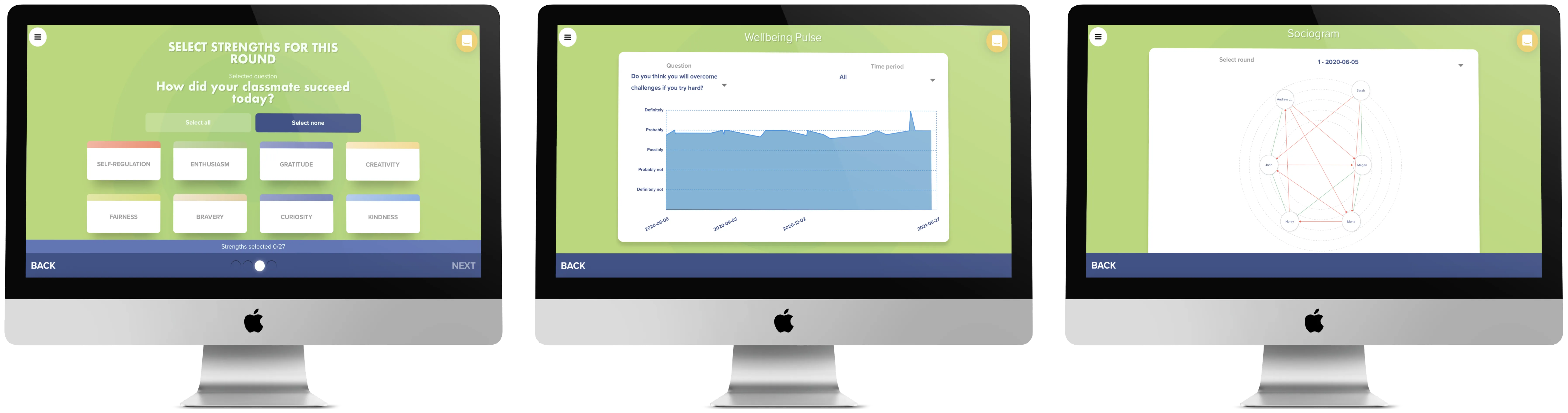 - Jokainen oppilas näkee sovelluksesta näkymän, jossa on luokiteltu 26 erilaista luonteenpiirrettä kuten esimerkiksi huumori, luovuus ja rohkeus