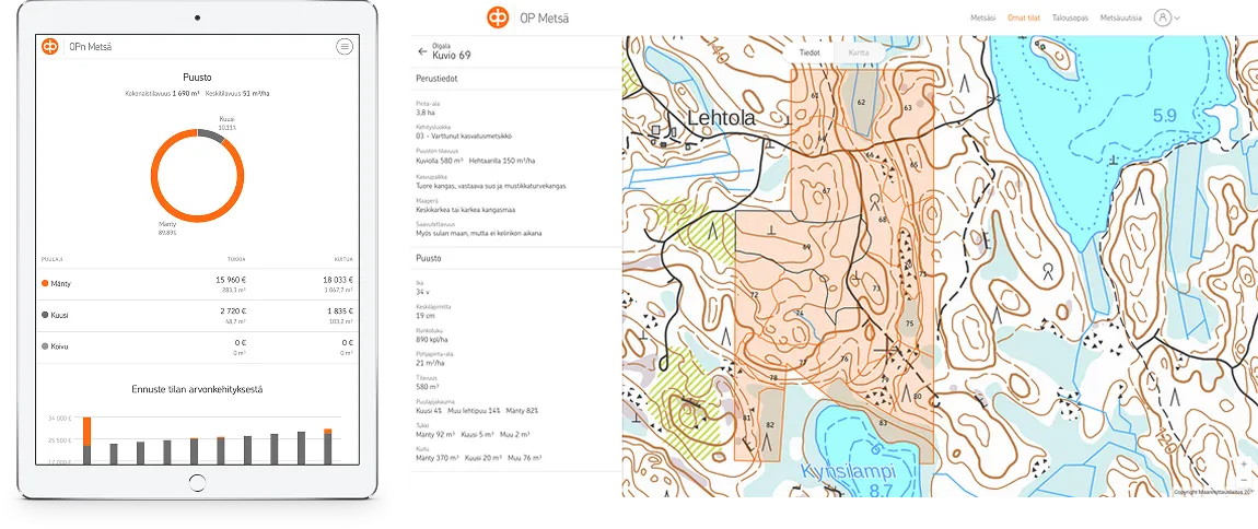 Loimme OP Metsä web-sovelluksen, joka kerää tietoa Metsäkeskukselta, Maanmittauslaitokselta ja Luonnonvarakeskuksesta yhden palvelun alle. Metsäomaisuuden tiedot siirretään Metsään.fi-verkkopalvelusta käyttäjän luvalla OP Metsään ja esitetään siellä käyttäjälle ymmärrettävässä muodossa. Sovellus näyttää metsän taloudellisen arvon sekä ennusteen metsän arvosta tulevina vuosina. Lisäksi se tarjoaa talousoppaan metsävarallisuuden hoitoon.