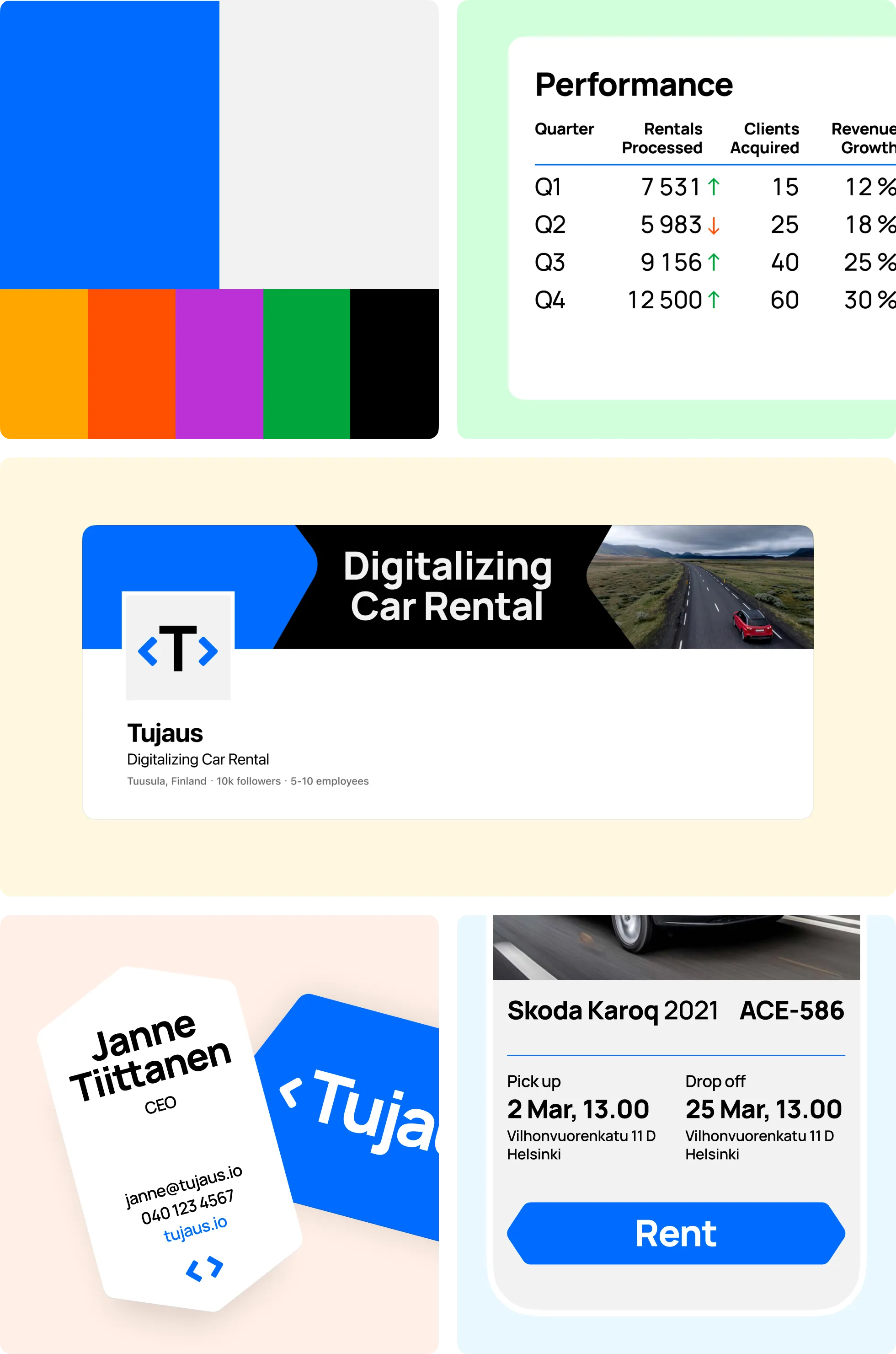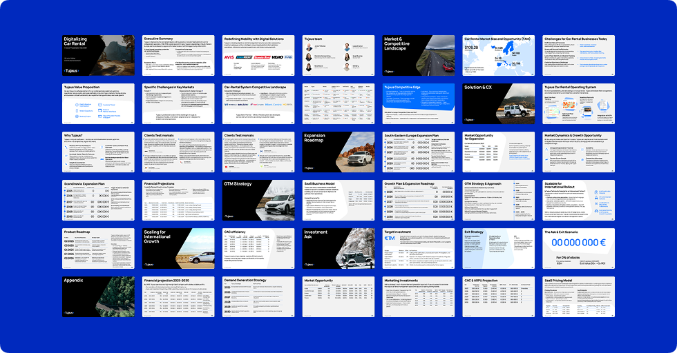 Tuotimme myös 46-sivuisen sijoittajaesityksen, joka on linjassa uuden brändin kanssa ja esittelee Tujauksen vision, kasvun ja markkinapotentiaalin.