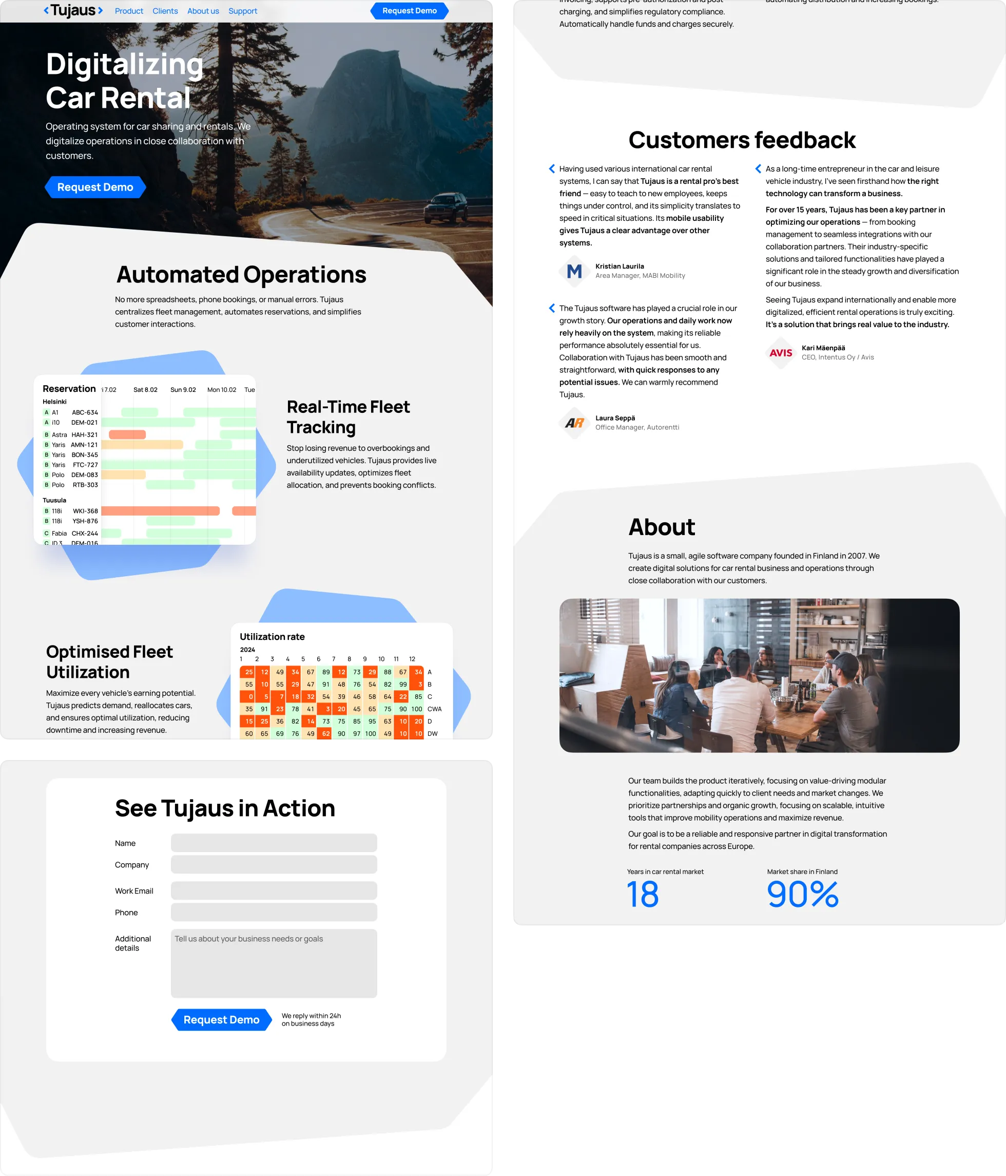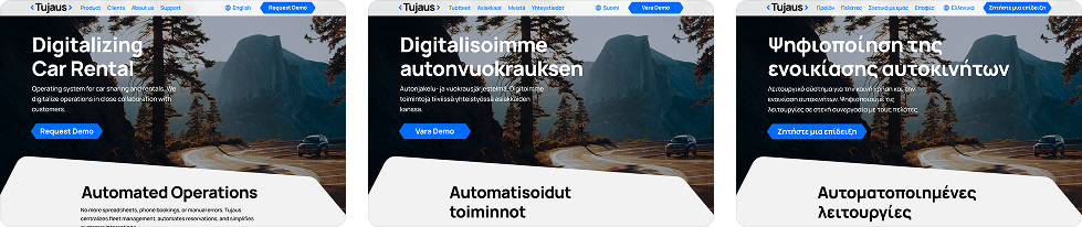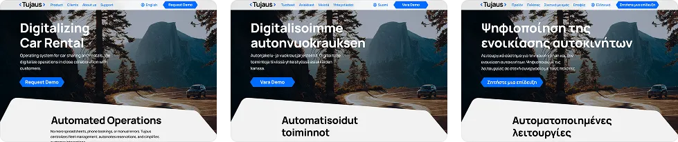 Tujaus tarvitsi joustavamman identiteetin ja monikielisen markkinointisivuston, joka skaalautuisi uusille markkinoille. Yritys valitsi meidät, koska rakennamme itsekin ohjelmistoja – ymmärrämme, miten tuotevetoinen yritys toimii ideasta lanseeraukseen.