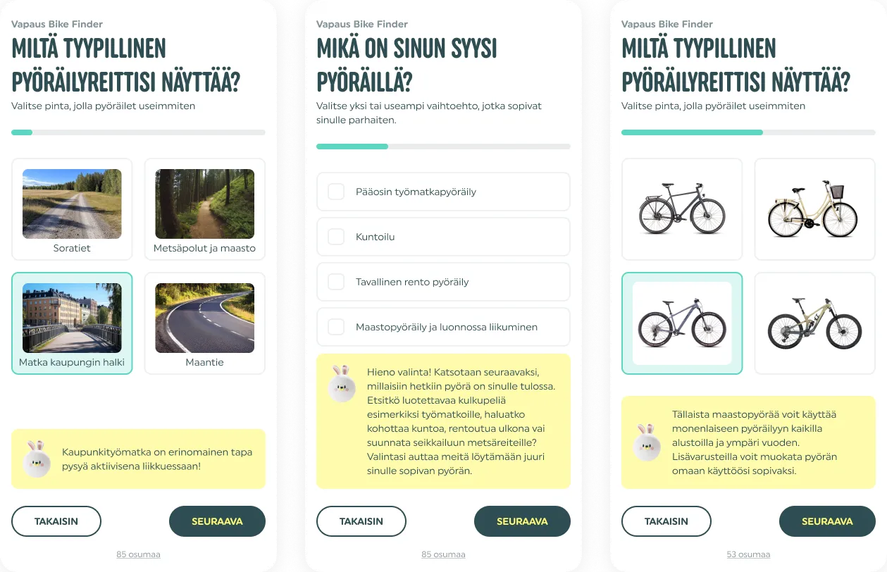 Kyselyn jälkeen pyöräilijä saa hänelle valikoidun listan markkinoilla saatavilla olevista pyöristä, joita on mahdollista suodattaa edelleen. Kunkin pyörän kohdalla löytyy usein suora linkki hintatietoineen verkkokauppaan.