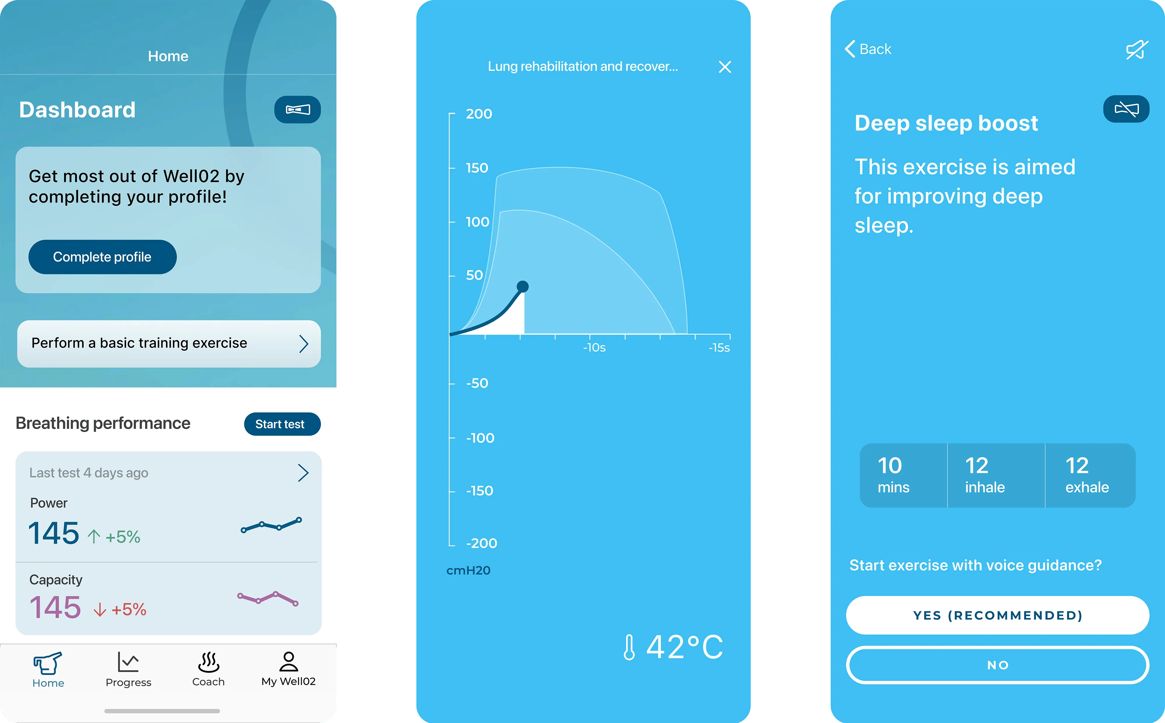 WellO2-sovelluksen mittaa käyttäjän keuhkojen ja hengitysteiden toimintaa ja mahdollistaa hengitysharjoitusten kautta toteutettavan keuhkojen kapasiteetin jatkuvan seurannan. Sovellus pystyy tulkitsemaan hengityksen toimintaa mahdollistaen muun muassa hengityslihasvoiman, hengityksen huippuvirtauksen sekä keuhkojen kapasiteetin seurannan.